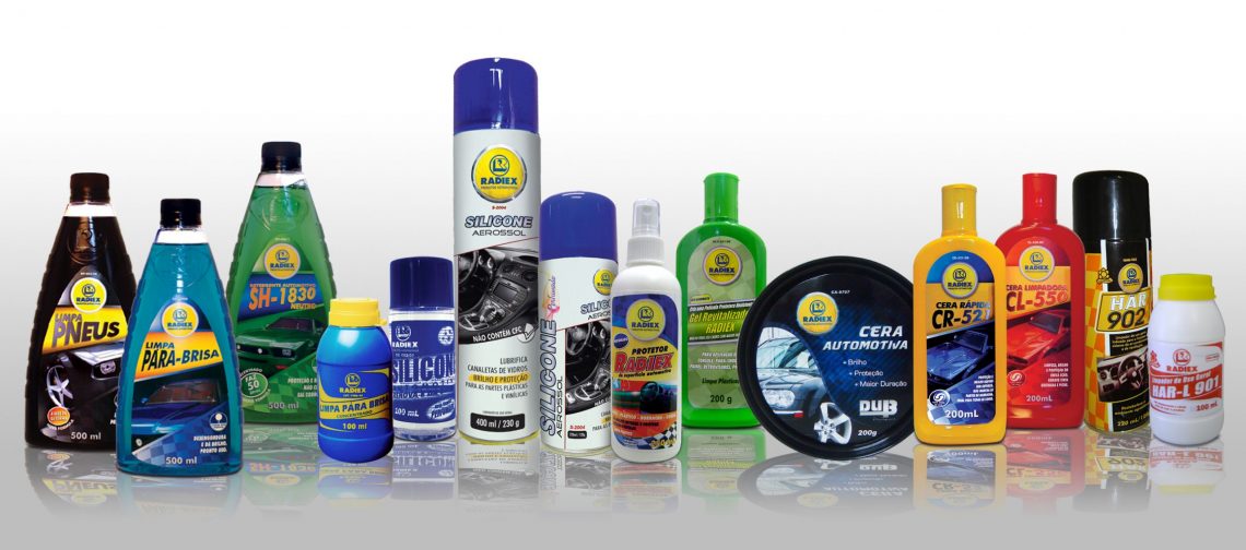A Radiex possui em sua linha uma gama completa de produtos para embelezamento automotivo, que inclui: Detergente Automotivo, Limpa Pneu, Silicone Aerosol e Líquido, Cera em Pasta, Cera Limpadora, Cera Rápida, Gel Revitalizador e Limpador Automotivo para uso geral.