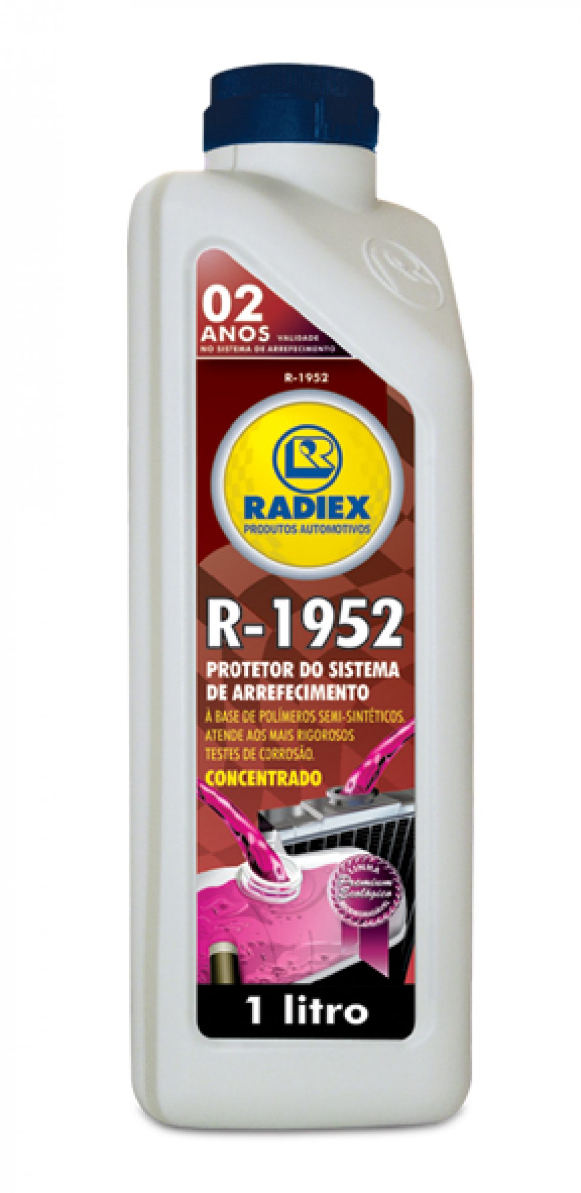 R-1952: Ecológico e concentrado. É um composto químico desenvolvido especialmente para oferecer proteção para as ligas de alumínio, ferro fundido, aço e metais não ferrosos de automóveis, caminhões, motores estacionários, etc. Prolonga a vida útil dos motores, oferecendo excelente proteção contra corrosão e cavitação, inibe o ressecamento das mangueiras. Proporciona excelente troca térmica e baixa condutividade elétrica. Protege o Sistema de Arrefecimento por até dois anos.